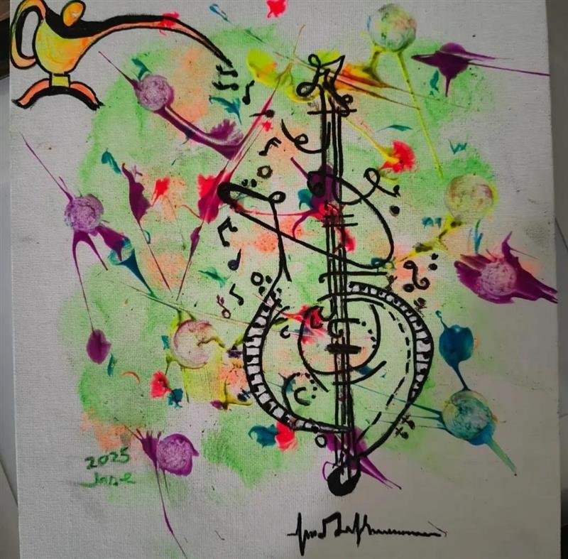 This picture has a story behind it, that’s why it was painted to remind a lady of curing her cancer. The guitar and the piano are her passions. There are two strings of the guitar broken. They are the cancer she had. The teapot for her afternoon tea and chat in English. The notes fall onto the piano and run away. At the end of the piano, you see the mini note person achieving the victory, and her heart beats; is her heart still beating fast?